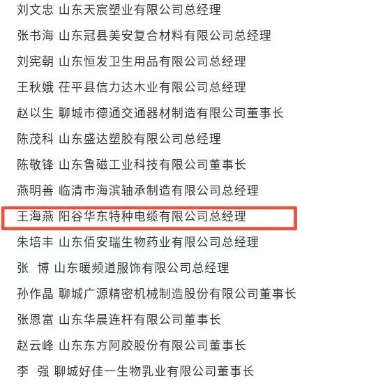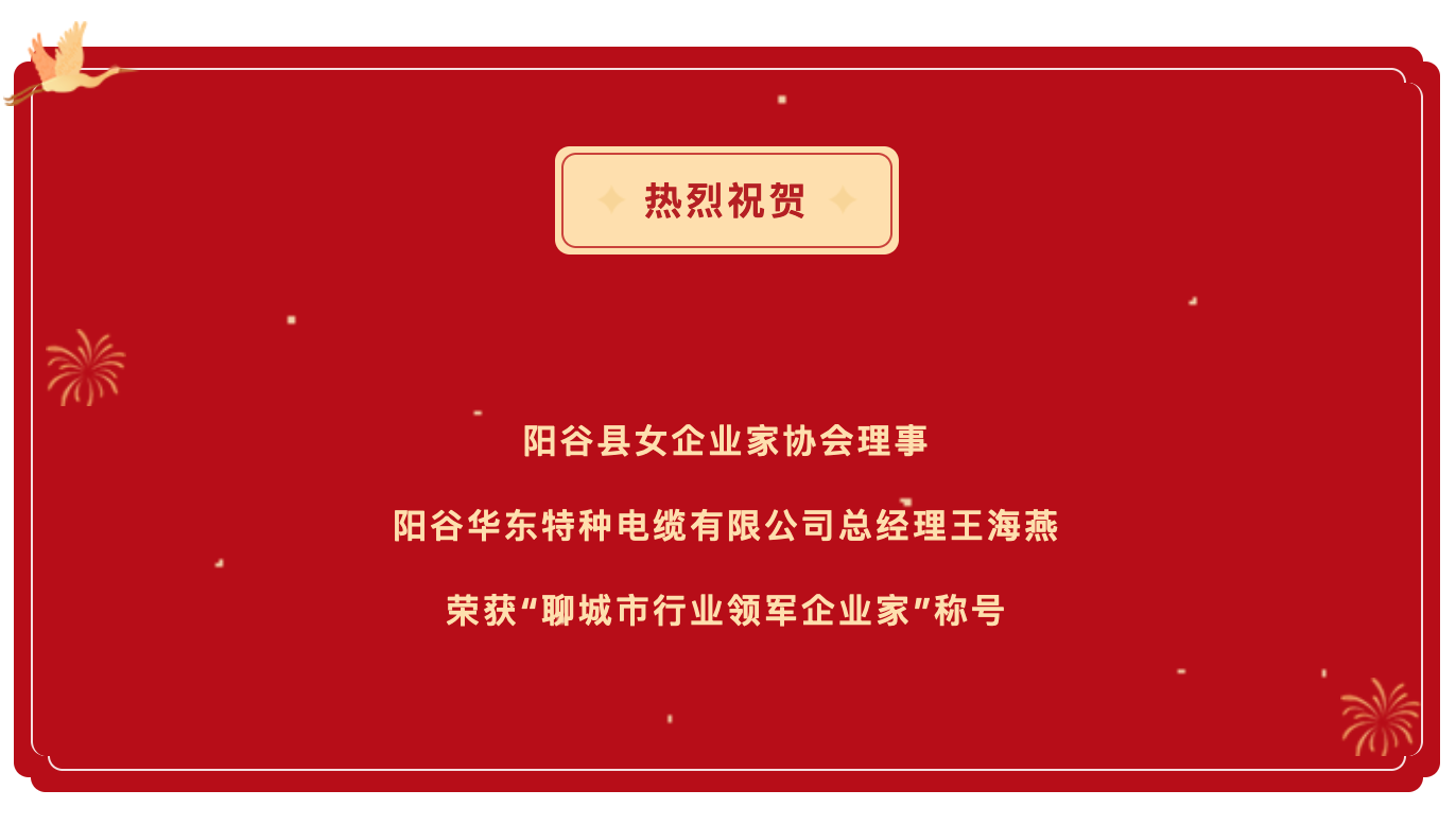 王海燕,現任陽谷華東特種電纜有限公司法人、總經理,兼任陽谷縣政協常務委員、陽谷縣女企業家協會理事、陽谷燭光協會會員,于2013年獨資創建了年產1000萬噸電線電纜生產企業,公司擁有員工300余人,占地面積 6萬平方米。公司先后被評為AAA 級守合同重信用企業、AAA級資信等級企業、中國3.15誠信企業、中國質量紅榜企業、山東省高新技術企業、阿里巴巴全網誠信通見證企業、百度誠信通2016誠信企業等。本人先后獲得陽谷縣總工會工人先鋒號、陽谷縣女企業家協會制造業卓越獎等榮譽。